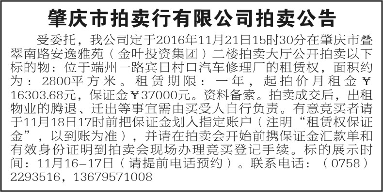 受委托,我公司定于2016年11月21日15时30分在肇庆市叠翠南路安逸雅苑(金叶投资集团)二楼拍卖大厅公开拍卖以下标的物:位于端州一路宾日村口汽车修理厂的租赁权,面积约为:2800平方米。租赁期限:一年,起拍价月租金¥16303.68元,保证金¥37000元。资料备索。拍卖成交后,出租物业的腾退、迁出等事宜需由买受人自行负责。有意竞买者请于11月18日17时前把保证金划入指定账户(注明“租赁权保证金”,以到账为准),并请在拍卖会开始前携保证金汇款单和有效身份证明到拍卖会现场办理竞买登记手续。标的展示时间:11月16-17日(请提前电话预约)。联系电话:(0758)2293516,13679571008
